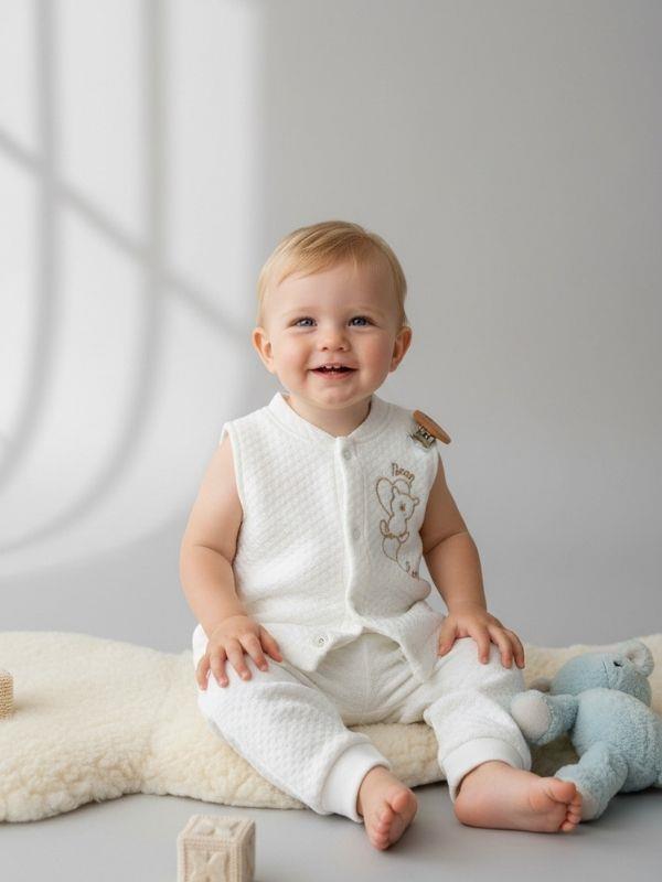 Bebek Kapitone Nakışlı Yelek, miniklerin hassas cildi düşünülerek tasarlanmış yumuşak dokusu ve hafif yapısıyla konforlu bir kullanım sunar. Kapitone yüzeyi sayesinde sıcaklığı dengede tutmaya yardımcı olurken, kolsuz formu bebeğin gün boyu rahatça hareket etmesini sağlar. Ön kısmında yer alan çıtçıtlı kapama detayı, pratik giydirme imkânı sunar ve ebeveynlere kullanım kolaylığı sağlar. Yuvarlak yaka yapısı boyun bölgesini sıkmadan nazik bir uyum sağlar. Göğüs kısmındaki sevimli nakış detayı, ürüne bebeklere özel sıcak ve şık bir görünüm kazandırır. Tek başına ya da zıbın, body ve tulumların üzerine kombinlenerek kullanılabilen bu yelek; ev içi kullanım, hastane çıkışı ve mevsim geçişleri için ideal bir tamamlayıcıdır. Aynı zamanda sade ve zarif tasarımıyla hediye alternatifi olarak da tercih edilebilir.