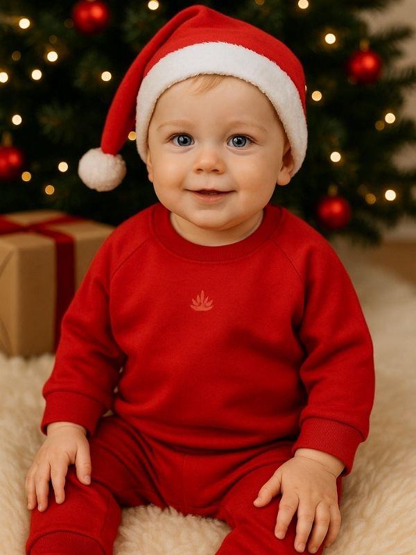 Yumuşacık dokusu ve yılbaşı ruhunu yansıtan tasarımıyla minikler için özel olarak hazırlanan bu takım, hem konforlu hem de göz alıcı bir seçenek sunuyor. Üst ve alt parçadan oluşan takım, esnek yapısıyla bebeğin gün boyu rahat hareket etmesini sağlar. Yuvarlak yaka uzun kollu üst, minimal nakış detayıyla sadelik ve şıklığı bir araya getirirken, alt parça geniş kesimiyle bebeğin hassas cildini sıkmadan konfor sunar. Özel kumaş karışımı sayesinde ısı yalıtımı sağlar ve soğuk havalarda ideal kullanım sunar. Yumuşak iç yüzeyi bebeğin narin tenine uygundur. Yeni yıl fotoğraf çekimleri, ev etkinlikleri ve özel gün kombinleri için mükemmel bir tercihtir. Şapka aksesuarıyla tamamlandığında tam bir yılbaşı konsepti oluşturur.