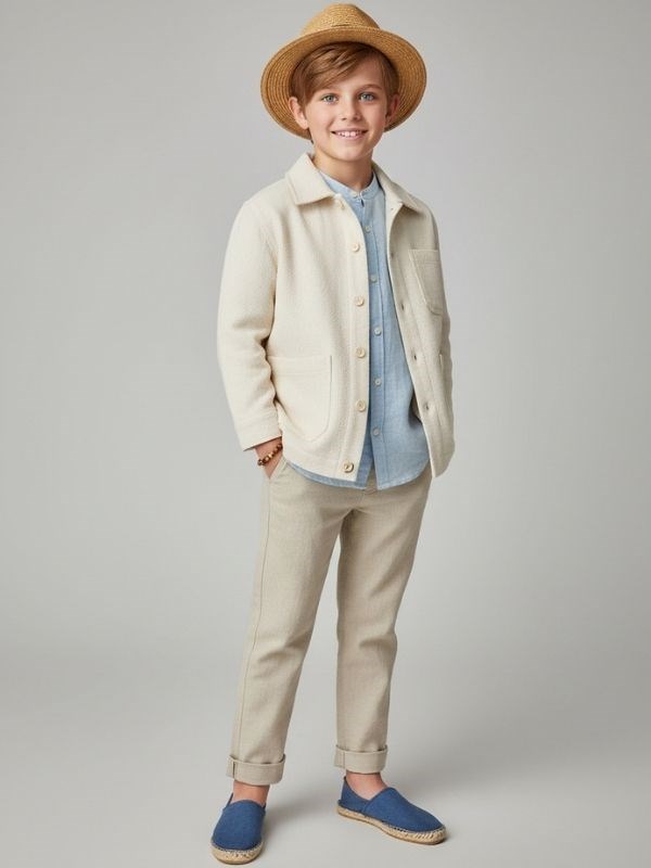 Ürün Açıklaması: Doğal dokusu ve rahat kalıbıyla öne çıkan erkek çocuk keten dokulu ceket, sezon kombinlerinin vazgeçilmez tamamlayıcısıdır. Hafif ve nefes alabilen yapısı sayesinde çocukların gün boyu konforla hareket etmesine olanak sağlar. Önden düğmeli tasarımı ve büyük cep detayları ile hem fonksiyonel hem de modern bir görünüm sunar. İçine basic tişört veya ince triko ile kombinlenerek günlük şıklık elde edilebilir. Yumuşak dokusu sayesinde cilt dostudur. Hem spor hem de daha özenli kombinlerde rahatlıkla kullanılabilir. Pantolon ve şortlarla kolayca uyum sağlar. Zekids koleksiyonunda zamansız, doğal ve şık bir parça arayanlar için ideal bir seçim.