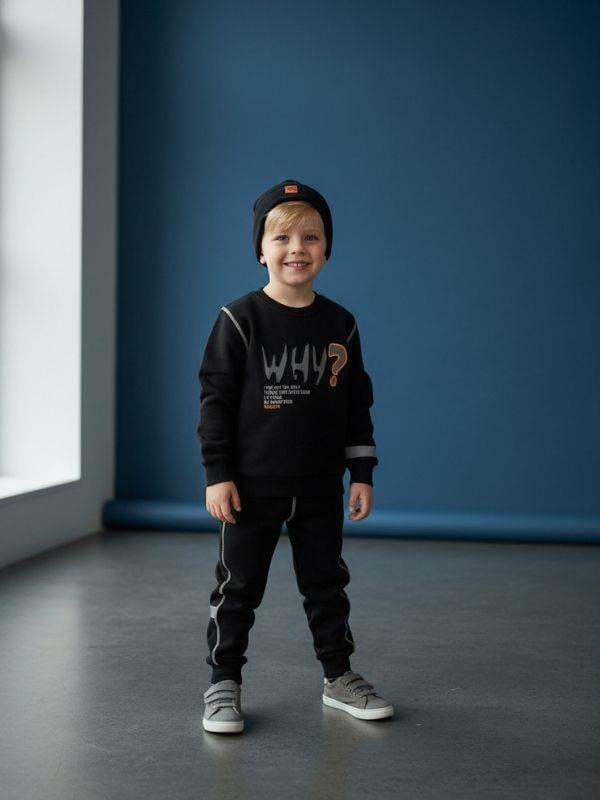 Günlük konforu modern tasarımla buluşturan bu erkek çocuk eşofman takımı, enerjik ve şehirli bir stil sunar. Üst parçada yer alan dikkat çekici yazı ve soru işareti baskısı takıma güçlü bir karakter kazandırırken, kontrast dikiş detayları sportif görünümü tamamlar. Alt parça ise sade formu ve fonksiyonel kesimiyle üst parça ile uyumlu bir bütünlük oluşturur. Yumuşak dokulu kumaşı sayesinde çocukların gün boyu rahat hareket etmesini destekler. Rib detaylı etek, bel ve paça kısımları formunu korurken, esnek bel yapısı kolay giyip çıkarma imkânı sunar. Hem okul sonrası kombinlerde hem de günlük kullanımda rahatlıkla tercih edilebilecek pratik ve stil sahibi bir settir. Takım Özellikleri: 2 parçadan oluşur: Sweatshirt + eşofman altı Sweatshirt: Bisiklet yaka, ön baskı detaylı, rib etek ve kol uçları Eşofman altı: Esnek bel yapısı, rahat kesim, rib paça Yumuşak ve konforlu kumaş dokusu Günlük kullanım ve aktif hareketler için ideal Sportif, modern ve dinamik tasarım