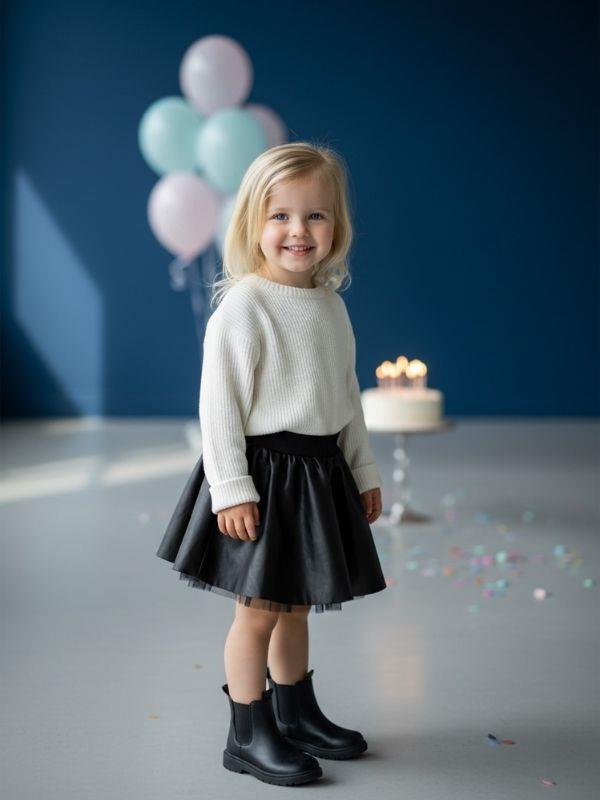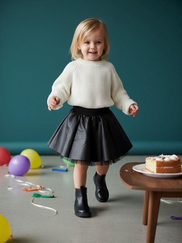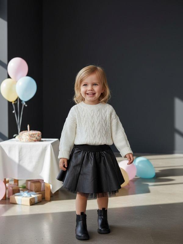 Modern çizgileri ve güçlü duruşuyla öne çıkan bu özel tasarım etek, çocuk stiline iddialı ama zarif bir dokunuş kazandırır. Günlük kombinlerden özel gün şıklığına kadar geniş bir kullanım alanı sunan model, sade üst parçalarla bile dikkat çekici bir görünüm oluşturur. Bel kısmında yer alan rahat ve esnek yapı, gün boyu konforlu bir kullanım sağlarken eteğin vücutta düzgün ve dengeli durmasına yardımcı olur. Belden itibaren hafifçe açılan formu, eteğe hacim kazandırarak hareketli ve şık bir siluet sunar. Her adımda kendini belli eden bu yapı, modern bir tarz yaratır. Diz hizasında biten etek boyu, çocukların rahatça hareket edebilmesini desteklerken şıklığından ödün vermez. Net hatlara sahip tasarımı sayesinde kazaklar, sweatshirtler, bluzlar ve gömleklerle kolayca kombinlenebilir. Günlük kullanımda spor ayakkabı veya botlarla daha cool bir stil elde edilebilirken, özel günlerde daha klasik ayakkabılarla şık bir görünüm yakalanabilir. Doğum günü organizasyonları, aile buluşmaları, okul etkinlikleri ve fotoğraf çekimleri için ideal olan bu etek; zamansız tasarımı sayesinde her sezon gardıroplarda yerini korur. Hem sade hem güçlü bir parça arayanlar için kurtarıcı bir alternatiftir. Şıklığı, modern duruşu ve rahatlığı bir arada sunan bu etek, çocuk gardıroplarının vazgeçilmez ve stil sahibi parçalarından biri olmaya adaydır