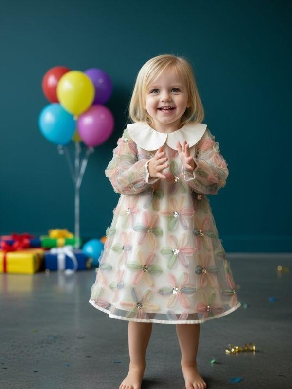 Kız Çocuk Bebe Yaka Çiçek İşlemeli Tasarım Elbise (25MELBZ36015)