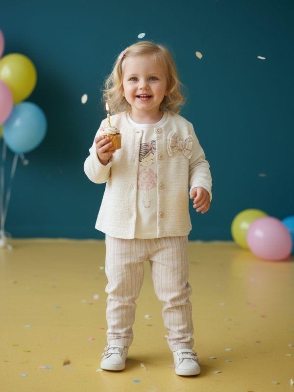 Kız Çocuk 3'lü Şık Kombin Seti - Ceket, Baskılı Tişört ve Çizgili Pantolon Minik prensesler için hem zarif hem rahat bir kombin! Bu üçlü set, özel günlerde veya günlük kullanımda şıklığıyla göz doldurur. Yumuşak dokulu, düğme detaylı ceket zarafeti ön plana çıkarırken, fiyonk süslemeli detayıyla şirinlik katıyor. İçindeki balerin baskılı tişört eğlenceli bir hava katarken, pastel tonlardaki çizgili pantolon modern görünüm ve konfor sunar. Esnek bel yapısı sayesinde rahat hareket imkânı sağlar. 3 parçadan oluşur: Ceket, tişört, pantolon Yumuşak ve kaliteli kumaş Fiyonk detaylı şık ceket Esnek bel yapılı çizgili pantolon Günlük kullanım ve özel günler için ideal