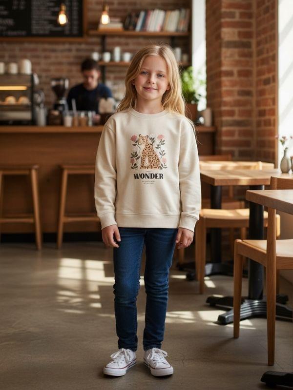 Doğadan ilham alan tasarımıyla dikkat çeken bu sweatshirt, hem rahatlığı hem de modern görünümüyle öne çıkıyor. Göğüs kısmındaki leopar ve çiçek baskısı, sade tasarıma zarif bir dokunuş kazandırarak şehir stiline enerjik bir hava katıyor. Yumuşak dokulu kumaşı sayesinde cilt dostu ve nefes alabilen bir yapıya sahiptir. Esnek yaka, kol ve bel ribanalarıyla hareket özgürlüğü sunar. Günlük kullanım, okul kombinleri veya hafta sonu gezileri için mükemmel bir seçimdir. Jean, tayt veya eteklerle kolayca kombinlenebilen bu sweatshirt; konfor, zarafet ve özgün stili bir araya getiren özel bir parça.