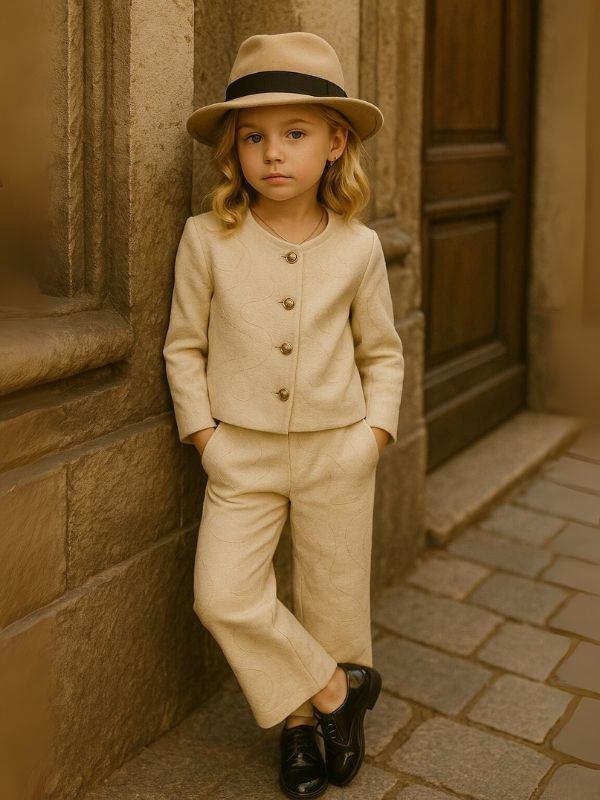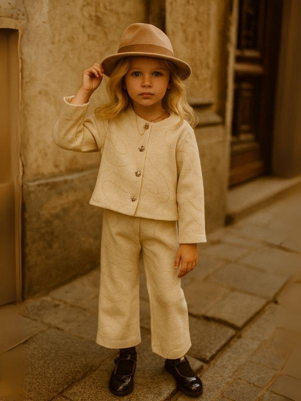 Ürün Açıklaması Şıklık ve rahatlığı bir araya getiren bu özel takım, 3-8 yaş arası kız çocukları için tasarlandı. İki parçadan oluşan takım; zarif düğme detaylı ceket ve aynı dokuda pantolondan oluşuyor. Yumuşak kumaş dokusu sayesinde gün boyu konfor sunarken, modern kesimiyle miniklerin stiline zarif bir dokunuş katıyor. Özellikler Takım İçeriği: Düğmeli ceket + düz kesim pantolon Kumaş Dokusu: Hafif kabartmalı özel desen, şık bir görünüm sağlar Düğme Detayı: Ön kısımda zarif tasarımlı düğmeler Kesim: Rahat kalıp, hareket özgürlüğü sağlar Yaş Aralığı: 3-8 yaş çocuklar için uygundur Kullanım Alanı Özel günler, davetler ve aile organizasyonları için şık bir tercih Günlük kombinlerde de rahatlıkla kullanılabilir Minimalist tasarımı sayesinde farklı aksesuarlarla kolayca kombinlenebilir