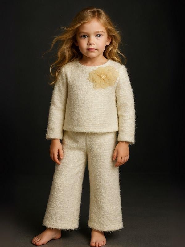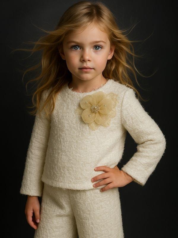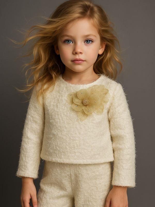 Ürün Açıklaması Küçük prensesler için tasarlanmış bu zarif takım, hem şık hem de rahat bir görünüm sunar. Yumuşak dokulu kumaşı sayesinde gün boyu konfor sağlarken, sade tasarımıyla modern bir şıklık kazandırır. Üst kısmındaki çiçek detaylı aplike, takıma romantik bir hava katarak özel günlerde de tercih edilebilecek zarif bir stil oluşturur. Detaylar Takım İçeriği: Uzun kollu üst ve geniş paça pantolon Tasarım: Minimalist görünüm, omuzda çiçek aplike detayı Kumaş: Yumuşak ve hafif tüylü dokusu ile sıcak tutar Kullanım Alanı: Günlük kombinlerden özel davetlere kadar geniş bir kullanım alanına sahiptir Konfor: Rahat kalıbı ile çocukların özgürce hareket etmesini sağlar Öne Çıkan Özellikler Modern ve sade çizgiler Gösterişli çiçek detayı ile dikkat çekici tasarım Rahat kesimi sayesinde günlük kullanıma uygun Kış ve mevsim geçişlerinde sıcak tutan yapısı