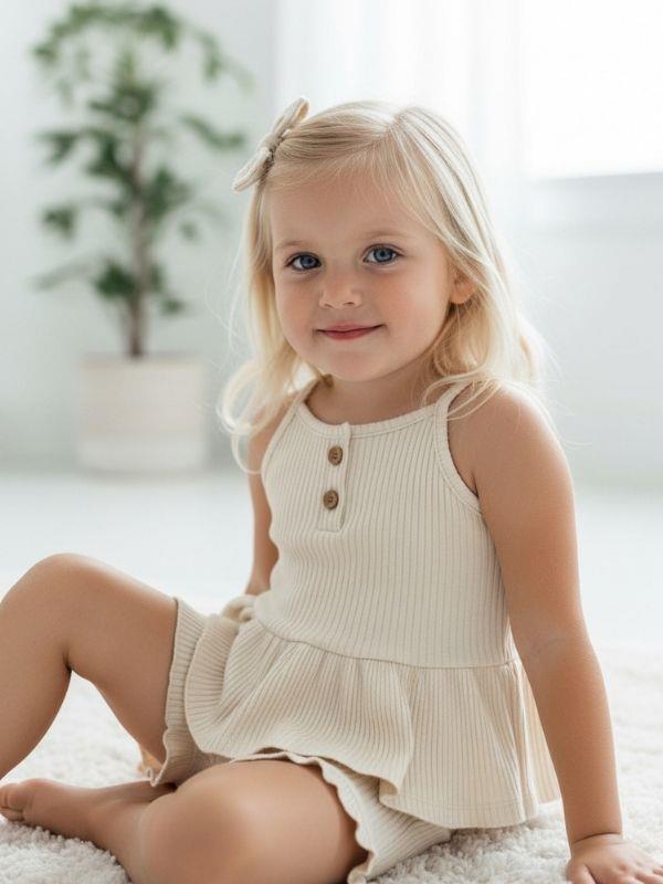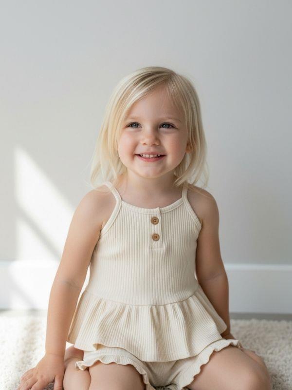 Kız Çocuk Fitilli Volanlı Takım Doğal dokusu ve yalın tasarımıyla öne çıkan bu fitilli takım, miniklerin gün boyu konforla hareket edebilmesi için özenle tasarlandı. Üst parçada yer alan ince düğme detayı ve bel kısmındaki hafif volan formu takıma zarif bir görünüm kazandırırken, alt parçadaki fırfır detayları tasarımı tamamlar. Yumuşak ve esnek fitilli kumaşı sayesinde cilde nazik bir his sunar. Rahat kalıbı ile oyun oynarken, evde ya da günlük kombinlerde özgürce kullanılabilir. Takım olarak şık bir duruş sunarken, parçalar ayrı ayrı da kolaylıkla kombinlenebilir. Öne Çıkan Özellikler: Yumuşak dokulu fitilli kumaş Üst parçada düğme ve volan detayı Alt parçada fırfırlı bitiş Rahat kalıp ve hareket özgürlüğü Günlük kullanıma uygun, zamansız tasarım