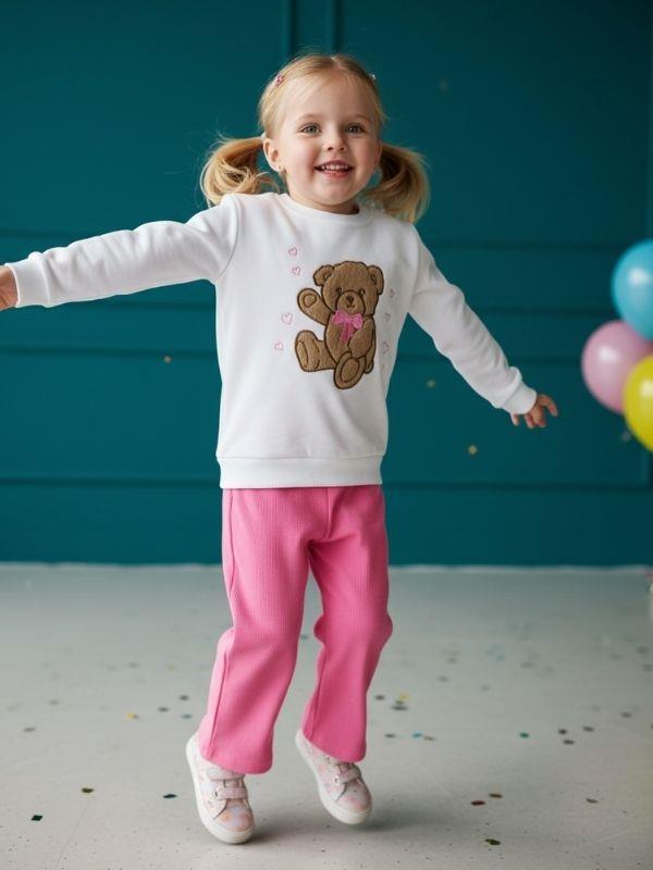 Kız Çocuk Pamuklu Ayıcık İşlemeli Geniş Paçalı Eşofman Takım (26MTKMZ22447)