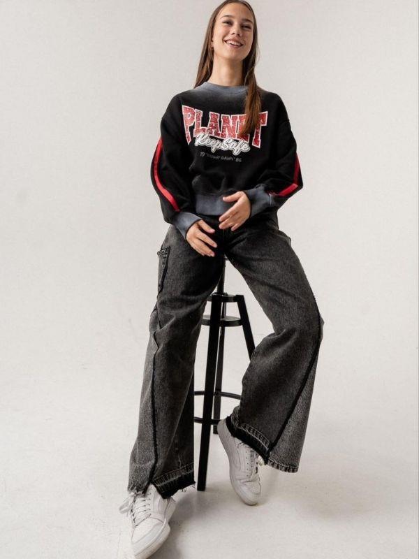 Genç kızların enerjisine ve tarzına uyum sağlayacak modern bir parça arıyorsanız, bu kız çocuk siyah oversize sweatshirt tam da gardıroplarında olması gereken bir ürün! Ön kısmında yer alan büyük ve dikkat çekici “PLANET Keep Safe” yazısıyla gençlere özgün bir stil sunar. Kollarındaki kırmızı şerit detayları, sportif ve dinamik bir görünüm kazandırırken, rahat kalıbı sayesinde gün boyu konfor sağlar. Okul kombinlerinden hafta sonu gezilerine, spor aktivitelerinden arkadaş buluşmalarına kadar her an giyilebilecek bu sweatshirt; tayt, kot pantolon veya eşofman altı ile kolayca kombinlenebilir. Serin havalarda sıcak tutarken aynı zamanda modern ve cool bir görünüm isteyen genç kızlar için ideal bir seçimdir. Kumaş / Fabric: %100 Pamuk Kalıp: Rahat – Oversize Yaka Tipi: Bisiklet Yaka Detay: Ön baskı yazı, yan kollarda kırmızı şerit detayı Stil: Teenage Spor & Casual