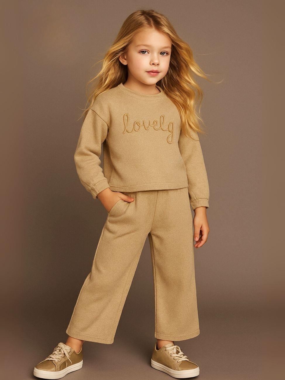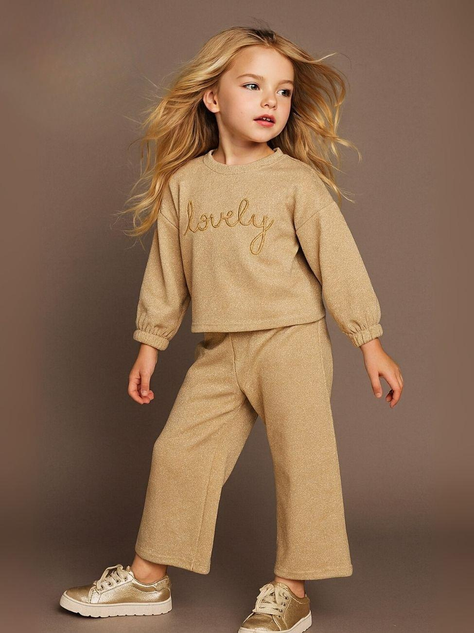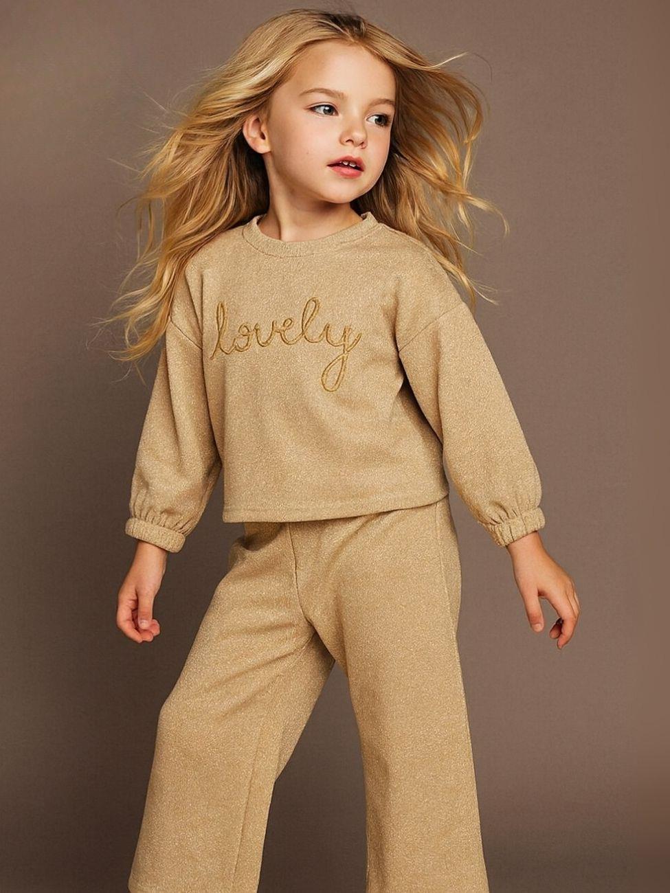 Ürün Açıklaması Modern ve rahat tasarımıyla öne çıkan bu şık çocuk takımı, miniklerin günlük stiline hem konfor hem de zarafet katıyor. Altın tonlarında ışıltılı kumaşı sayesinde sade ama dikkat çekici bir görünüm sunarken, üst kısmındaki “lovely” yazı detayı parçaya sevimli bir dokunuş ekliyor. Günlük kombinlerden özel günlere kadar geniş bir kullanım alanı sunar. Detaylar Takım İçeriği: Uzun kollu sweatshirt ve geniş paça pantolon Renk: Altın ışıltılı bej tonları Detay: Üstte nakış yazı (“lovely”) tasarımı Kumaş: Hafif esnek, parlak görünümlü ve rahat dokulu Kullanım Alanı: Günlük giyim, özel davetler, kutlamalar ve arkadaş buluşmaları Konfor: Esnek paçalar ve lastikli bilekler sayesinde özgür hareket imkânı Öne Çıkan Özellikler Parlak kumaş dokusu ile şık görünüm “Lovely” yazı detayı ile modern ve tatlı tasarım Rahat kesimi sayesinde gün boyu konforlu kullanım Spor ayakkabı ya da şık botlarla kolayca kombinlenebilir