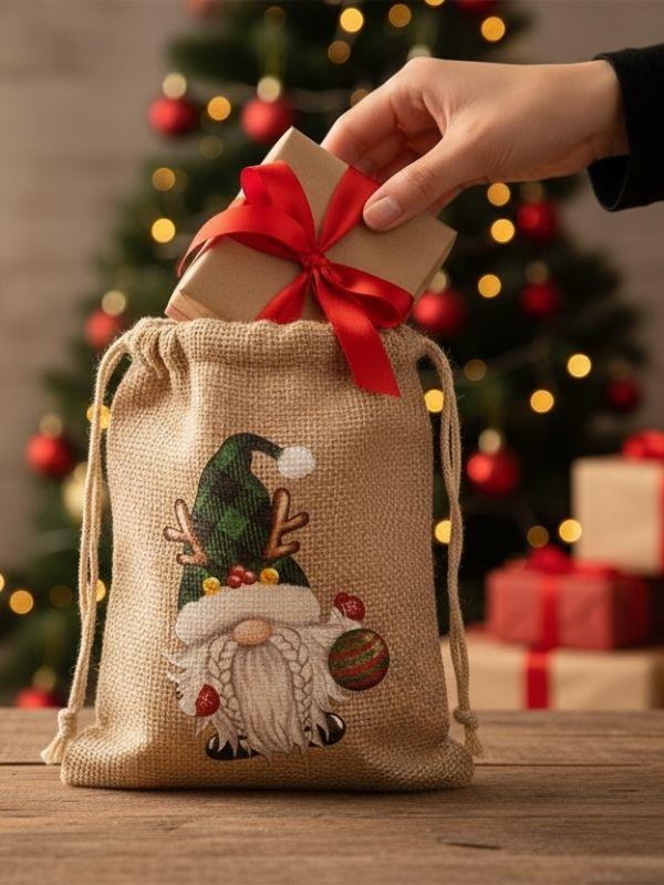 Yılbaşı ruhunu hediye paketlerinize taşıyın! Doğal jüt kumaştan üretilen bu şık kese, sevimli cüce (gnome) deseniyle dikkat çeker. İp bağlama detayları sayesinde kolayca kapanır ve içindekileri güvenle korur. Özellikler: Ölçü: 10 cm x 15 cm Malzeme: Jüt kumaş Desen: Noel temalı cüce baskı Kullanım: Hediye paketleme, küçük takı, şekerleme veya dekoratif amaçlı Doğal dokusu ve sıcak tasarımıyla yılbaşı hediyelerinize rustik bir hava katar.