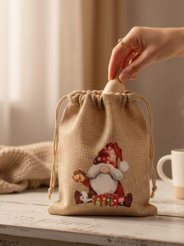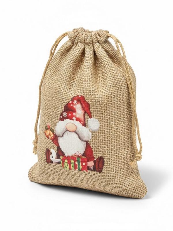 Sevimli Noel Baba Cüce Baskılı Hediyelik Jüt Kese(10x15 cm) (26MHDY001-5)