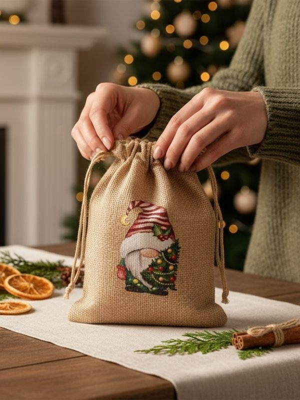 Sevimli Noel Baba Cüce Baskılı Hediyelik Jüt Kese(10x15 cm) (26MHDY001-7)